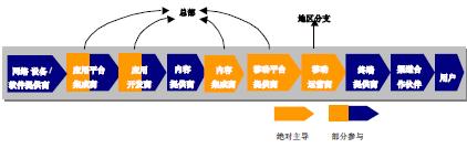 和記電訊是香港最大的流動(dòng)網(wǎng)絡(luò)運(yùn)營商。2004年1月,和記電訊率先在香港推出世界級(jí)的3G服務(wù)。其目標(biāo)就是成為最佳的3G移動(dòng)通信多媒體通信運(yùn)營商。和記電訊在產(chǎn)業(yè)鏈上承擔(dān)的角色如圖3所示。