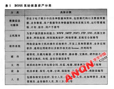 BOSS系統(tǒng)涉及的信息繁多,如何保護關鍵的數(shù)據(jù)不被泄漏是運營商非常重視的一個問題。信息分級用來評估運營商是否建立了信息資產(chǎn)管理的規(guī)范,明確了信息資產(chǎn)的內(nèi)容和級別,制定了有效的安全保護措施,如果沒有,應該明確BOSS系統(tǒng)內(nèi)的關鍵信息資產(chǎn)并列出清單,依據(jù)國家保密級別制定科學的信息資產(chǎn)分級標準,并作為風險評估的依據(jù)。參照國際信息系統(tǒng)安全標準BS7799/ISO17799對信息資產(chǎn)的描述和定義,可以將BOSS系統(tǒng)信息資產(chǎn)按照表1的方法進行分類。