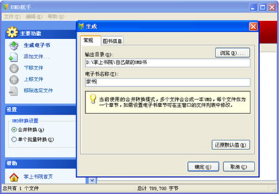 點(diǎn)擊“添加文件”,將你想要轉(zhuǎn)換的電子書(shū)添加至軟件窗口,大批量轉(zhuǎn)換的用戶可一次性選中多個(gè)文件添加,添加完畢后,你可以隨時(shí)通過(guò)“上移文件”和“下移文件”按鈕來(lái)調(diào)整你文件擺放的位置,或者移除不需要轉(zhuǎn)換的文件。確認(rèn)后,選擇合并轉(zhuǎn)換或是單個(gè)批量轉(zhuǎn)換,合并轉(zhuǎn)換是將添加的文件合并成一本UMD電子書(shū),單個(gè)批量轉(zhuǎn)換是每個(gè)文件生成一本UMD電子書(shū)。設(shè)置完后點(diǎn)擊“生成電子書(shū)”,在彈出的對(duì)話框中設(shè)置輸出目錄、電子書(shū)名稱、電子書(shū)封面、作者、來(lái)源后點(diǎn)擊確認(rèn),出現(xiàn)正在轉(zhuǎn)換的進(jìn)度條,完成制作后會(huì)自動(dòng)打開(kāi)電子書(shū)所在的目錄,你的電子書(shū)制作完成,是不是非常簡(jiǎn)單。
