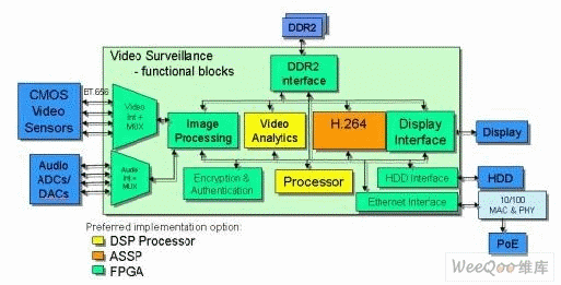 經(jīng)過(guò)壓縮后的數(shù)據(jù)通過(guò)硬盤(pán)驅(qū)動(dòng)器接口存儲(chǔ)至視頻存儲(chǔ)服務(wù)器,或通過(guò)以太網(wǎng)網(wǎng)絡(luò)發(fā)送。視頻數(shù)據(jù)傳送到顯示器之前通常是取自硬盤(pán)驅(qū)動(dòng)器,并經(jīng)過(guò)了解碼以及一些圖像后處理,如縮放、色彩空間轉(zhuǎn)換或覆蓋應(yīng)用。通常情況下,存儲(chǔ)器接口(如DDR2)是用來(lái)存儲(chǔ)視頻幀。此外,某些系統(tǒng)要求視頻內(nèi)容的實(shí)時(shí)加密以確保安全和源/用戶身份驗(yàn)證。最后,需要用處理器控制和協(xié)調(diào)/排定各種不同的任務(wù)。