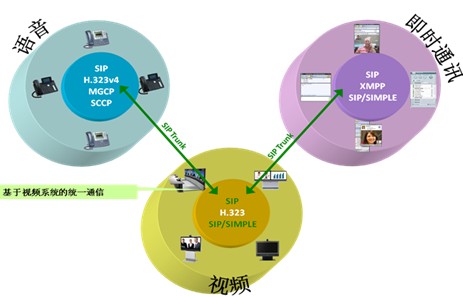 所有的視頻系統(tǒng)采用H.323/SIP方式獨(dú)立存在,網(wǎng)絡(luò)層采用SIP協(xié)議和即時(shí)通訊、語(yǔ)音等進(jìn)行連接,這樣就可以克服視頻終端遷移帶來(lái)的種種弊端。這樣做的前提條件,是要在視頻系統(tǒng)里部署一個(gè)視頻通訊服務(wù)器,完成H.323/SIP的轉(zhuǎn)換,完成基于H.323/SIP的雙流和呼叫控制,而不是一個(gè)傳統(tǒng)的H.323的網(wǎng)守可以完成的功能。一個(gè)完整的基于視頻的統(tǒng)一通信系統(tǒng),只有采用這種方式,才可以實(shí)現(xiàn)真正的視頻系統(tǒng)、即時(shí)通信系統(tǒng)、語(yǔ)音系統(tǒng)的統(tǒng)一通信。