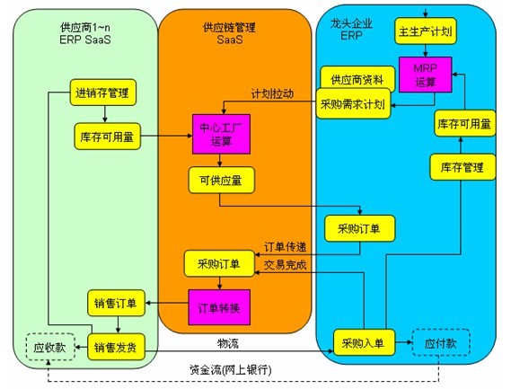 在線需求計(jì)劃管理。當(dāng)龍頭完成企業(yè)內(nèi)部的MRP運(yùn)算后,便輸出“采購需求計(jì)劃”;該計(jì)劃作為供應(yīng)鏈管理平臺,中心工廠(或稱虛擬企業(yè))運(yùn)算的輸入,此刻供應(yīng)鏈管理平臺可以動(dòng)態(tài)地挖掘供應(yīng)商的(ERP)的“庫存可用量”,并計(jì)算出“可供應(yīng)量”,該數(shù)據(jù)可提供給龍頭企業(yè)編制“采購訂單”。