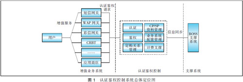 增值業(yè)務認證鑒權控制系統(tǒng)負責增值業(yè)務處理中公共的鑒權與數據管理。通過提取各業(yè)務運營中的認證、鑒權共性特點,形成統(tǒng)一接口與增值業(yè)務系統(tǒng)互聯(lián),負責業(yè)務運營中的核心控制;同時負責增值生產類數據的保存,負責BOSS支撐系統(tǒng)、業(yè)務系統(tǒng)、CP/SP間數據的傳遞。