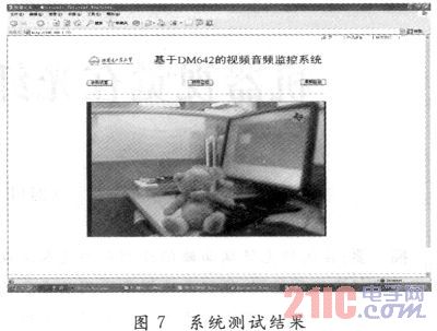 在集成開發(fā)環(huán)境CCS(C6000)下,加載相關驅動程序,對本系統(tǒng)進行了測試。CCD攝像頭為標準PAL制式,圖像采集的幀頻為25幀/s,圖像的分辨率為720×576像素。測試結果如圖7所示。測試結果表明,網(wǎng)絡連接正常,用戶在PC端可通過瀏覽器訪問系統(tǒng),成功實現(xiàn)遠程監(jiān)控。