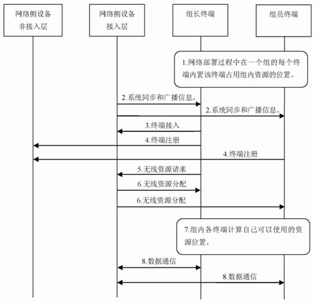 (6)網(wǎng)絡(luò)側(cè)設(shè)備接入層向組長(zhǎng)終端發(fā)布分配給該終端組的無(wú)線資源。