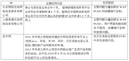 一方面是信息產(chǎn)業(yè)部管理手段的加強(qiáng),另一方面則是運(yùn)營(yíng)商管理方式的嚴(yán)肅,從表格中可以看出,中國(guó)移動(dòng)對(duì)SP的懲罰已經(jīng)具有相當(dāng)?shù)牧Χ。在為增殖業(yè)務(wù)打造了相關(guān)的業(yè)務(wù)品牌之后,整個(gè)產(chǎn)業(yè)鏈條的控制權(quán)目前還是掌握在運(yùn)營(yíng)商手中。
