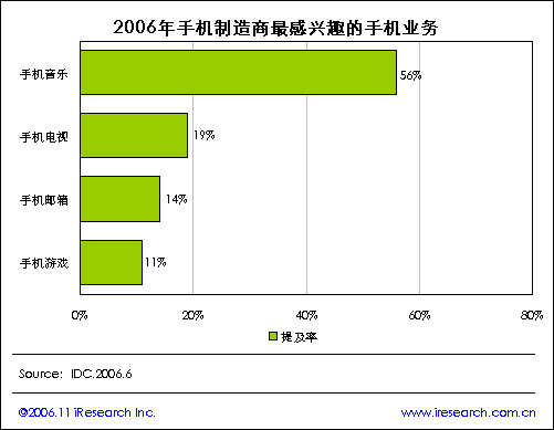 iResearch艾瑞市場咨詢根據(jù)IDC統(tǒng)計數(shù)據(jù)顯示,2006年手機制造商最感興趣的手機業(yè)務情況,手機音樂是手機制造商最感興趣的業(yè)務,提及率達到56%,然后依次是手機電視19%、手機郵箱14%以及手機游戲11%.