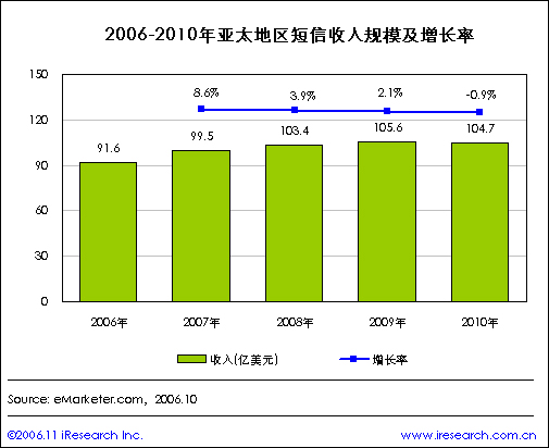 iResearch艾瑞市場咨詢整理eMarketer的相關(guān)數(shù)據(jù)顯示,2006年亞太地區(qū)短信收入將達到91.6億美元,2007年預(yù)計短信收入為99.5億美元,比2006年增長8.6%,2008年短信收入將達到103.4億美元,比2007年增長3.9%;2009年的短信收入預(yù)計為105.6億美元。預(yù)計到2010年亞太地區(qū)短信收入將達到104.9億美元,比2009年增長2.1%.