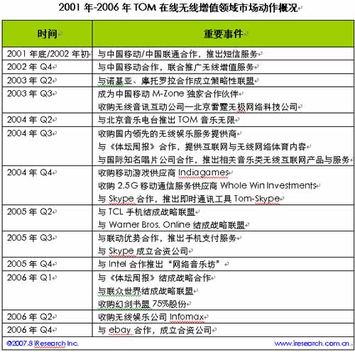 2000年中,TOM在線正式推出,這家一開始便以無線增值為特色的企業(yè)符合了當時中國互聯(lián)網(wǎng)市場的環(huán)境,那時無線增值業(yè)務(wù)如火如荼,第五媒體的概念呼之欲出。隨后,便開始了與各大無線媒體、傳統(tǒng)媒體等一系列的合作和收購,所涉及的領(lǐng)域涵蓋短信、無線音樂、手機游戲、手機支付、手機體育新聞、即時通訊等許多行業(yè),一個龐大的無線媒體帝國看似已經(jīng)牢不可破。直到,2006年第四季度與ebay易趣合并,開始涉足電子商務(wù)。