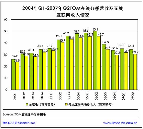 在2006年第二季度總營收以及無線互聯(lián)網(wǎng)服務(wù)收入分別達到歷史最高點(分別達到5010萬美元和4571萬美元)之后,TOM在線各季收入及無線互聯(lián)網(wǎng)收入呈逐季下滑趨勢,至2007年第二季度,TOM在線的總營收為3439萬美元,來自無線互聯(lián)網(wǎng)服務(wù)的收入為3024萬美元!