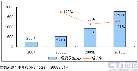 圖1 2007-2010年中國視頻應(yīng)用市場規(guī)模預(yù)測