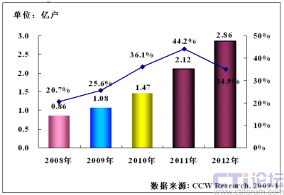 計世資訊(CCW Research)研究預測,2009年中國移動支付用戶數(shù)將達到1.08億戶,其同比增長率將達到25.6%,預計2010年中國移動支付用戶數(shù)將達到1.47億戶,其同比增長率將達到36.1%,2011年中國移動支付用戶數(shù)將達到2.12億戶,其同比增長率將達到44.2%,2012年中國移動支付用戶數(shù)將達到2.86億戶,其同比增長率將達到34.9%。