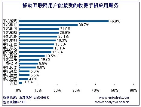 CTI論壇(ctiforum)06月22日消息:據(jù)易觀國(guó)際(Analysys International)《中國(guó)手機(jī)應(yīng)用市場(chǎng)用戶調(diào)研報(bào)告2009》研究發(fā)現(xiàn),移動(dòng)互聯(lián)網(wǎng)用戶可接受收費(fèi)的應(yīng)用主要是手機(jī)游戲和手機(jī)銀行/支付,其比例分別為47%和31%,而手機(jī)游戲也是移動(dòng)互聯(lián)網(wǎng)用戶使用比例較高的手機(jī)應(yīng)用服務(wù)之一。另外,用戶可接受程度較高的還包括手機(jī)郵箱、手機(jī)導(dǎo)航、手機(jī)炒股、手機(jī)電視/視頻以及手機(jī)殺毒等應(yīng)用。而移動(dòng)互聯(lián)網(wǎng)用戶對(duì)于手機(jī)社區(qū)和手機(jī)搜索收費(fèi)的接受度較低。研究發(fā)現(xiàn),移動(dòng)互聯(lián)網(wǎng)用戶可接受收費(fèi)的應(yīng)用主要是手機(jī)游戲和手機(jī)銀行/支付,其比例分別為47%和31%,而手機(jī)游戲也是移動(dòng)互聯(lián)網(wǎng)用戶使用比例較高的手機(jī)應(yīng)用服務(wù)之一。另外,用戶可接受程度較高的還包括手機(jī)郵箱、手機(jī)導(dǎo)航、手機(jī)炒股、手機(jī)電視/視頻以及手機(jī)殺毒等應(yīng)用。而移動(dòng)互聯(lián)網(wǎng)用戶對(duì)于手機(jī)社區(qū)和手機(jī)搜索收費(fèi)的接受度較低。