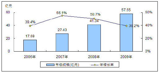 圖: 2006-2009年中國BPO市場規(guī)模與增長