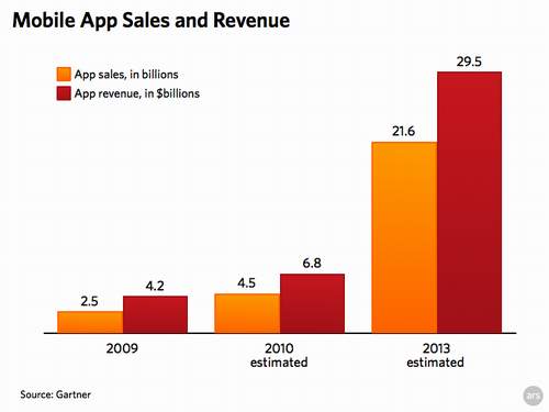 Gartner預(yù)計(jì),2010年的應(yīng)用銷量將達(dá)到45億,收入為68億美元。如果蘋果保持現(xiàn)有的速度,即每月銷售2500萬個(gè)應(yīng)用,其全年銷量將達(dá)到3億,市場(chǎng)份額為67%。蘋果應(yīng)用商店2010年的收入則有望達(dá)到45億美元,其中蘋果的分成約為13.5億美元,其余則歸開發(fā)者所有。然而,隨著新款iPhone和平板電腦的上市,蘋果有望吸引更多的用戶,從而對(duì)應(yīng)用下載量起到提升作用,市場(chǎng)份額也將有所增加