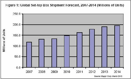 據(jù)iSuppli公司,機頂盒出貨量未來幾年將繼續(xù)增長。消費者收看模式發(fā)生轉(zhuǎn)變,通過互聯(lián)網(wǎng)提供的電視內(nèi)容越來越流行,從而將為提供商創(chuàng)造條件,在數(shù)字家庭的激烈爭奪中獲得新的營業(yè)收入來源。