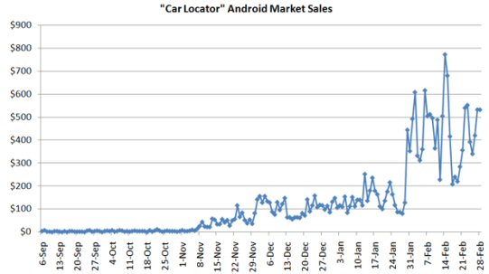 在被Android應(yīng)用商店列為特別應(yīng)用前,“汽車(chē)定位器”每天獲得的收入約為80至100美元。此后,其銷(xiāo)售額便大幅增加,平均每天達(dá)到435美元,情人節(jié)那天更是達(dá)到創(chuàng)紀(jì)錄的772美元。