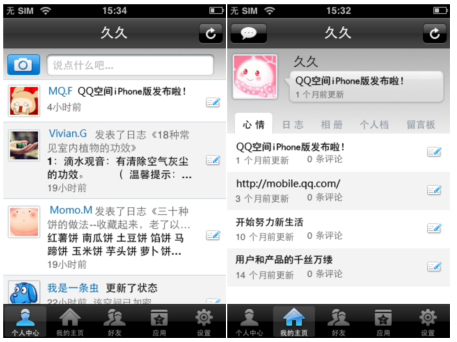 點擊我的主頁,可以瀏覽和撰寫自己的心情、查看日志,瀏覽和上傳照片,并且還可以查看好友留言。與其他手機(jī)平臺的QQ空間不同的是,QQ空間foriPhone將空間好友單獨列出來,更人性化的加入了“誰看過我”和“我看過誰”功能,方便用戶查找。