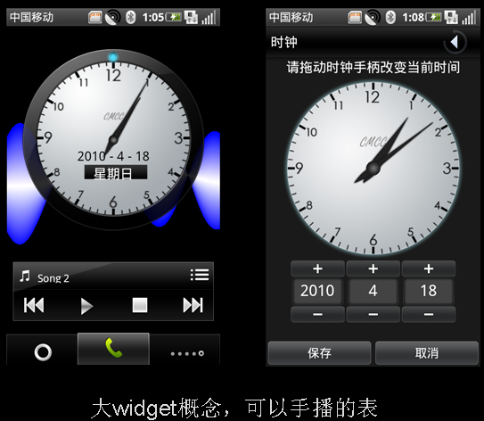 第三,引入大widget概念。Widget給用戶提供了簡易接口來執(zhí)行一些常用功能。OPhone2.0版本首次引入了大widget概念,將手機人性化操作提升到了新的高度。譬如,手機最簡單也是最常用的顯示時間功能,就在OPhone2.0中被設(shè)計成了一個“可以用手播動的表”,用戶不必再繁瑣地輸入數(shù)字來修改時間。