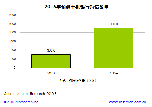 艾瑞咨詢根據(jù)Juniper Research發(fā)布的預(yù)測數(shù)據(jù)發(fā)現(xiàn),由于新類型的手機銀行短信提醒的應(yīng)用,到2015年,全球手機銀行短信量將達(dá)到900億條每年,相當(dāng)于每個手機銀行用戶每隔一天就會收到一條銀行發(fā)來的信息。