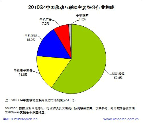 根據(jù)艾瑞咨詢即將發(fā)布的2010年第四季度中國移動互聯(lián)網(wǎng)市場監(jiān)測數(shù)據(jù)顯示,2010Q4中國移動互聯(lián)網(wǎng)市場整體規(guī)模達(dá)到51.1億,同比增長19.8%,環(huán)比增長20.3%。艾瑞咨詢分析認(rèn)為,本季度電信運(yùn)營商對計費(fèi)通道治理開始收尾,移動增值市場整體復(fù)蘇。同時手機(jī)電子商務(wù)、手機(jī)游戲業(yè)務(wù)領(lǐng)域取得良好市場表現(xiàn),受手機(jī)應(yīng)用商店、位置簽到服務(wù)等新型手機(jī)業(yè)務(wù)創(chuàng)新的帶動,移動互聯(lián)網(wǎng)規(guī)?傮w攀升,投融資比重增加。