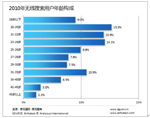 據(jù)Enfodesk易觀智庫近期發(fā)布的研究表明:中國無線搜索市場用戶結(jié)構(gòu)在2010年已經(jīng)發(fā)生巨大變化。對比2009年數(shù)據(jù)來看,無線搜素用戶在性別、年齡、職業(yè)分布方面,已經(jīng)發(fā)生快速的變化。