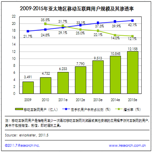 iResearch艾瑞咨詢整理eMarketer數(shù)據(jù)時發(fā)現(xiàn),2010年亞太地區(qū)移動互聯(lián)網(wǎng)用戶規(guī)模達到4.732億,較2009年增長35.5%,占手機用戶總數(shù)的24.8%。預計2011年移動互聯(lián)網(wǎng)用戶數(shù)將達6.233億,增幅為31.7%,占手機用戶總數(shù)的29.1%。在未來的5年里,亞太地區(qū)移動互聯(lián)網(wǎng)用戶規(guī)模增速有所下降,但其在手機用戶總數(shù)中的比例將進一步增加。