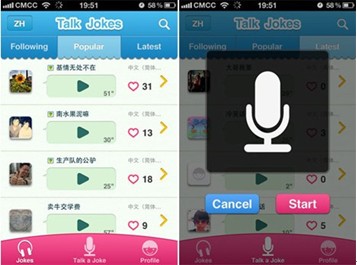 Talk Jokes是一款輕量級語音笑話分享應(yīng)用,鼓勵用戶通過真人錄音的方式上傳和分享自己的笑話,專注于“講笑話”的這部分語音垂直市場。