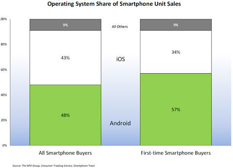 Android和iPhone一共占據(jù)了第四季度智能手機(jī)銷售總量的90%。Android在四季度依舊保持了48%的智能手機(jī)市場份額,同時Android設(shè)備在首次購買智能手機(jī)的消費者群中表現(xiàn)更好。根據(jù)NPD每月提供的Smartphone Track服務(wù)的最新數(shù)據(jù),所有在第四季度初次購買智能手機(jī)的消費者中,其中57%的消費者選擇了Android設(shè)備,而相比較下只有34%的消費者選擇了iPhone。