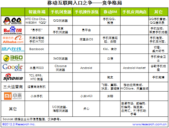 2012年,移動互聯(lián)網“入口之爭”仍將繼續(xù),隨著移動終端的普及,用戶數(shù)量和流量都將快速增長,各企業(yè)的核心策略仍以用戶數(shù)和流量為主,并在此基礎上開始探索商業(yè)模式,并開始布局整個生態(tài)系統(tǒng)?梢灶A見,下一步的競爭將蔓延到更具體的應用類型上,但是互聯(lián)網企業(yè)的參與度不會像入口型應用這么高,投資和兼并事件將有所增加。