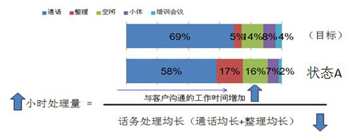 通話狀態(tài)是CSR的重要生產(chǎn)時(shí)間。筆者同過很多CSR交談,發(fā)現(xiàn)他們都有此看法,通話均長適當(dāng)增長通話狀態(tài)就會(huì)提高。但我認(rèn)為這是一個(gè)吃力不討好的方法,影響了個(gè)人的效能與績效收入。對于CSR個(gè)體,更重要的是提升自己的應(yīng)答能力,適當(dāng)降低自我的通話均長與整理均長。只要做好小休狀態(tài)(CSR主要責(zé)任)、空閑狀態(tài)(排班師、現(xiàn)場主管主要責(zé)任)、整理狀態(tài)(CSR、小組主要責(zé)任),通話狀態(tài)就會(huì)自然增加。