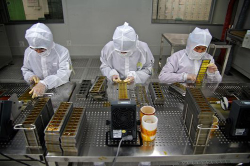 在富士康深圳龍華工廠,一名工人正在檢查Macbook Pro的元件。