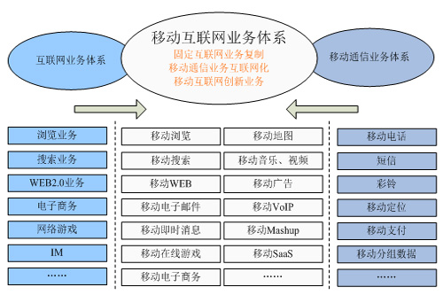 根據(jù)工信部相關(guān)信息,移動(dòng)互聯(lián)網(wǎng)的業(yè)務(wù)體系主要包括三大類,如下圖所示:一是固定互聯(lián)網(wǎng)的業(yè)務(wù)向移動(dòng)終端的復(fù)制,從而實(shí)現(xiàn)移動(dòng)互聯(lián)網(wǎng)與固定互聯(lián)網(wǎng)相似的業(yè)務(wù)體驗(yàn),這是移動(dòng)互聯(lián)網(wǎng)業(yè)務(wù)的基礎(chǔ)。二是移動(dòng)通信業(yè)務(wù)的互聯(lián)網(wǎng)化,如Skype推出的移動(dòng)VOIP業(yè)務(wù)、中國移動(dòng)的飛信業(yè)務(wù)等。三是結(jié)合移動(dòng)通信與互聯(lián)網(wǎng)功能而進(jìn)行的有別于固定互聯(lián)網(wǎng)的業(yè)務(wù)創(chuàng)新,這是移動(dòng)互聯(lián)網(wǎng)業(yè)務(wù)發(fā)展方向。對創(chuàng)業(yè)者而言,移動(dòng)互聯(lián)網(wǎng)的業(yè)務(wù)創(chuàng)新關(guān)鍵是如何將移動(dòng)通信的網(wǎng)絡(luò)能力與互聯(lián)網(wǎng)的網(wǎng)絡(luò)與應(yīng)用能力進(jìn)行聚合,從而創(chuàng)新出適合移動(dòng)終端的互聯(lián)網(wǎng)業(yè)務(wù),如移動(dòng)Web2.0業(yè)務(wù),如微博、移動(dòng)位置類互聯(lián)網(wǎng)業(yè)務(wù)等。