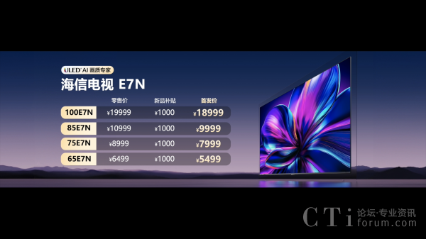 海信AI電視E7N提供了65/75/85/100吋四個版本,零售價分別是6499元、8999元、10999元、19999元,首發(fā)享受體驗金1000元,到手價5499元、7999元、9999元、18999元,9月29日0點正式開售;同時享受3000元政企雙補(2000元1級能效政府至高補貼+1000元企業(yè)至高補貼),以及6000元套購補貼(海信品質(zhì)家電全套購,滿額至高再補貼6000元)。