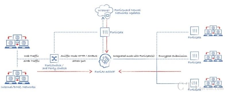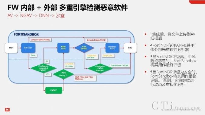 此外,AI技術(shù)還貫穿于Fortinet的多個產(chǎn)品與功能中,形成高效的工作流。以威脅檢測與響應(yīng)為例,當(dāng)FortiGate的雙引擎也無法確定某個文件的合法性時,它可以將該文件提交給FortiNDR進行深度分析,利用云端深度神經(jīng)網(wǎng)絡(luò)AI進行0 Day攻擊、勒索軟件等深層次分析。若仍無法確定,還可進一步提交給FortiSandbox,在虛擬機環(huán)境中進行模擬操作,進行更為深入的檢測。在這一系列流程與技術(shù)的支持下,F(xiàn)ortinet的威脅檢測與響應(yīng)能力已達(dá)到業(yè)界頂尖水平,向滿分100分邁進。