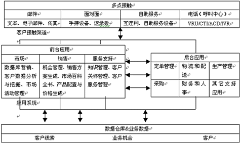 從源頭上把握最便捷的方法就是了解概念,即什么是CRM。世界著名IT系統(tǒng)項目論證與決策權(quán)威機(jī)構(gòu)—Gartner Group(注:Gartner Group在全球率先提出了CRM的概念)認(rèn)為CRM是迄今為止規(guī)模最大的IT概念,但CRM并非等同于單純的信息技術(shù)或管理技術(shù)。它是一種企業(yè)商務(wù)戰(zhàn)略,目的是使企業(yè)根據(jù)客戶分段進(jìn)行重組,強(qiáng)化使客戶滿意的行為并聯(lián)接客戶與供應(yīng)商之間的過程,從而優(yōu)化企業(yè)的可盈利性,提高利潤并改善客戶的滿意程度。具體操作時,它將看待“客戶”的視角從獨(dú)立分散的各個部門提升到了企業(yè)層次,各個部門負(fù)責(zé)與客戶的具體交互,但向客戶負(fù)責(zé)的卻是整個企業(yè)。以一個面孔面對客戶,是成功實施CRM的根本。為了實現(xiàn)CRM,企業(yè)與客戶連接的每一環(huán)節(jié)都應(yīng)實現(xiàn)自動化管理。那么企業(yè)與客戶連接的環(huán)節(jié)究竟包括些什么內(nèi)容,Gartner Group進(jìn)一步提出了周而復(fù)始的五領(lǐng)域概念:戰(zhàn)略、戰(zhàn)術(shù)、業(yè)務(wù)過程、技能和技術(shù)。戰(zhàn)略集中體現(xiàn)了企業(yè)的經(jīng)營目標(biāo)和理念,還往往滲透于企業(yè)的文化。如CRM強(qiáng)調(diào)以客戶為中心對企業(yè)來說就是一種戰(zhàn)略性選擇;戰(zhàn)術(shù)是戰(zhàn)略的承載體,構(gòu)成戰(zhàn)略的日常要素必須體現(xiàn)和服務(wù)于企業(yè)的整體戰(zhàn)略。如以客戶為中心企業(yè)組織結(jié)構(gòu)的重組就是企業(yè)戰(zhàn)略在戰(zhàn)術(shù)環(huán)節(jié)的反映;CRM的業(yè)務(wù)過程包括銷售管理、市場管理、分析管理、交貨與后臺處理自動化(如ERP)和服務(wù)管理幾個方面,即Gartner所宣稱的營銷自動化的概念。在此需要強(qiáng)調(diào)的是CRM的業(yè)務(wù)過程的重組也必須體現(xiàn)企業(yè)理念重組和組織重組的價值取向;后兩項技能和技術(shù)則構(gòu)成了實現(xiàn)前三者的堅強(qiáng)支撐,是各環(huán)節(jié)實現(xiàn)自動化管理的可靠保證和重要組成部分。