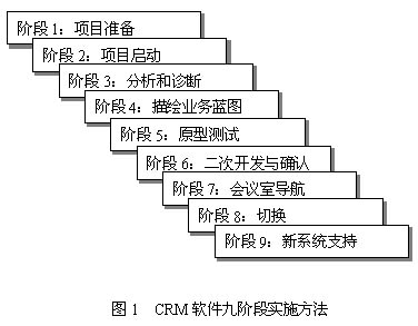 在此,結(jié)合項目管理和管理信息系統(tǒng)實施的特點,本文給出CRM軟件系統(tǒng)九階段的實施方法。如圖所示