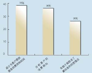 關(guān)于所應(yīng)用的CRM類型,有5家是呼叫中心,5家是分析型,7家是運營型,2家是屬于大型企業(yè)CRM。其中13家擁有動態(tài)客戶數(shù)據(jù)庫,占到68.4%。這其中又有42%利用數(shù)據(jù)庫作客戶記錄,26.3%作為客戶支持使用,15.7%用作統(tǒng)計分析,另有16%作為市場推廣。保險公司與客戶聯(lián)系的方式,從重要性來看依次為:面對面\電話\網(wǎng)絡(luò)\傳真,這說明保險公司對于與客戶進(jìn)行人性化交流的重視。在問到CRM的主要作用時,有5家表示使用CRM有助于保險業(yè)了解自身的經(jīng)營情況,幫助公司準(zhǔn)確地發(fā)現(xiàn)贏利客戶和具有贏利潛力的客戶,有7家認(rèn)為使用CRM有助于分析客戶的消費傾向,有7家認(rèn)為使用CRM有助于優(yōu)化信息和資源管理。在問到是否愿意為像CRM系統(tǒng)這樣的咨詢或服務(wù)付費時,有11家表示愿意,占到57.8%。