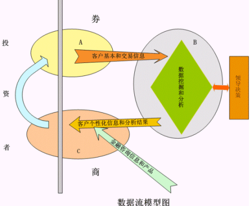 。。如上圖所示,股票投資者(客戶)根據(jù)自己對證券市場的判斷,進行二級市場的股票買賣行為。客戶的投資行為是通過券商的投資通道進行的,而券商的信息系統(tǒng)收集和統(tǒng)計這些信息和數(shù)據(jù),同時和客戶的基本信息進行結合,進行統(tǒng)一提交給數(shù)據(jù)倉庫。根據(jù)大量的客戶基本信息和交易信息,進行數(shù)據(jù)挖掘和數(shù)據(jù)分析,得到想要的各個特征數(shù)據(jù),并且對各項指標進行總結。然后根據(jù)數(shù)據(jù)分析的結果,在采用先進的客戶關系管理的業(yè)務流程,利用各種資源,為特定客戶進行個性化服務,達到為客戶服務的最終目的。而客戶在根據(jù)所提供的個性化服務,進行股票買賣操作,從而進入下一個循環(huán)。這樣的循環(huán)與現(xiàn)存的經(jīng)紀業(yè)務的無被再利用數(shù)據(jù)流是有著根本的不同。