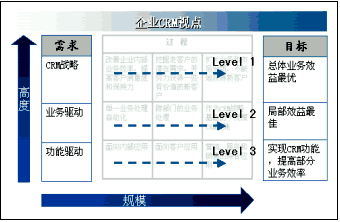 從全球CRM最佳實(shí)踐來(lái)看,企業(yè)實(shí)施CRM不外乎CRM軟件功能驅(qū)動(dòng)、業(yè)務(wù)驅(qū)動(dòng)和客戶關(guān)系戰(zhàn)略驅(qū)動(dòng)三種情況。所以,實(shí)施CRM的視點(diǎn)也有三種,如下圖所示:一是,從CRM產(chǎn)品功能角度,根據(jù)產(chǎn)品所能提供的功能,選擇自己需要實(shí)施的CRM內(nèi)容。這種視點(diǎn)充其量只能夠讓企業(yè)擁有部分CRM的功能,有限地提高部分業(yè)務(wù)處理的效率。二是,從業(yè)務(wù)角度出發(fā),通過(guò)局部?jī)?yōu)化業(yè)務(wù)流程,實(shí)施CRM。在項(xiàng)目中所涉及的業(yè)務(wù)流程可能要貫穿多個(gè)CRM功能模塊。這種視點(diǎn)解決了一部分業(yè)務(wù)問(wèn)題,它主要以流程效益或部門(mén)效益最優(yōu)為目標(biāo)。三是,從企業(yè)CRM戰(zhàn)略角度出發(fā),從總體、全局、發(fā)展的高度規(guī)劃和實(shí)施CRM。CRM戰(zhàn)略驅(qū)動(dòng)視點(diǎn)不僅追求局部效益最優(yōu),而且能夠?qū)崿F(xiàn)企業(yè)總體業(yè)務(wù)效益的最大化。雖然,企業(yè)可以根據(jù)自身客戶關(guān)系管理的實(shí)際情況選擇CRM視點(diǎn)的高度,但是在絕大多數(shù)企業(yè)的實(shí)踐中,都會(huì)選擇CRM戰(zhàn)略高度作為著眼點(diǎn),規(guī)劃企業(yè)客戶關(guān)系管理。