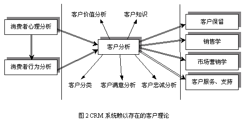 大多數(shù)CRM研究人員和應用專家不認為CRM存在作為應用支撐的理論基礎,充其量認為CRM只是支持企業(yè)營銷的商業(yè)策略。隨著企業(yè)追求市場活動績效的熱情的提高,企業(yè)開始采用定性和定量的分析方法決策其與市場和客戶有關的企業(yè)活動,如有效的客戶滿意度評價、客戶分類、客戶盈利率分析等。而這些決策迫切需要相關的理論基礎為指導,真正擺脫靠經(jīng)驗進行決策的做法。當前CRM的理論研究和學術探討并未真正走向體系化、統(tǒng)一化,所以造成CRM市場中提供的功能參差不齊。CRM系統(tǒng)必須存在一個完整的理論體系為指導,本文將CRM系統(tǒng)賴以存在的理論基礎統(tǒng)稱為客戶理論(Theory on Customer)。