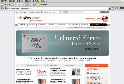 2004年7月,Salesforce剛上市時,股票交易價為11美元。最近一個月,它的股價則在40美元附近徘徊。成立7年多的Salesforce.com在全世界的2.48萬個公司擁有超過50.1萬個用戶,并以每年80%的速度增長,客戶滿意度高達97%。