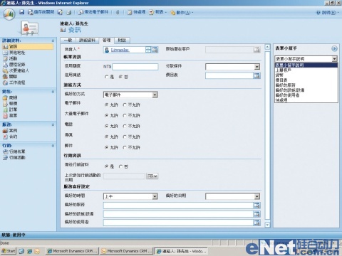Dynamics CRM 4.0的聯絡人,除基本信息之外,還可以針對偏好的聯絡方式、活動記錄、次要聯絡人或者商機管理等,儲存更詳細的記錄。