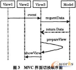 在界面設計上,使用MVC模式。MVC模式包括三類對象,模型Model是應媚對象,視圖View是它在屏幕上的表示,控制器定義了用戶輸入的響應方式。MVC架構使表現(xiàn)與邏輯分開,使得多個視圖可以共用同一個MVC模型。MVC界面切換順序圖如圖3。