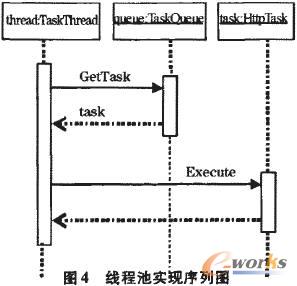 為解決頻繁創(chuàng)建線程導致的線程生命周期開銷和資源消耗問題,借鑒在網絡服務中常見的線程池技術。由于服務器需要處理大量的網絡請求,為避免大量的線程創(chuàng)建和銷毀所導致的問題,通常使用線程池來處理網絡請求,即在線程池中預先創(chuàng)建一定數(shù)量的線程,當新的網絡任務到達時,由線程池中一個空閑線程執(zhí)行該任務,任務執(zhí)行完畢后該線程并不銷毀,而是重新返回線程池中并等待新的任務到達。對于J2ME設備需要頻繁連接網絡的情況下,線程池不失為一個提高性能、節(jié)約系統(tǒng)資源的好方法。圖4給出了線程池實現(xiàn)的序列圖。