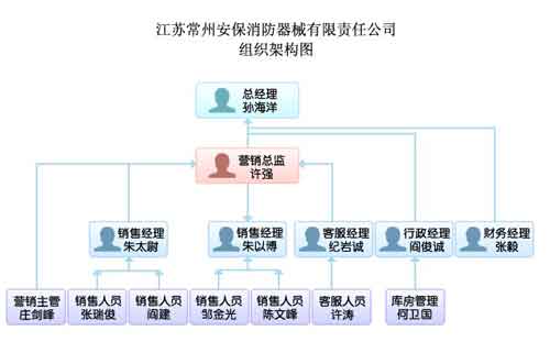 百會CRM模擬了“江蘇常州安保消防器械有限責(zé)任公司”的組織架構(gòu),設(shè)置了一套專門針對產(chǎn)品銷售型、生產(chǎn)制造型企業(yè)的CRM系統(tǒng),對CRM系統(tǒng)所提供的模塊和不同職位的人員所具備的權(quán)限都進行了界定,這樣一套系統(tǒng)就足夠以銷售和生產(chǎn)制造為主的公司進行使用。該公司的具體組織架構(gòu)見下圖。