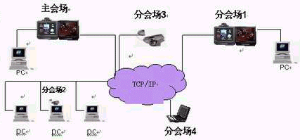 可視化Ip電話會(huì)議系統(tǒng): 是利用計(jì)算機(jī),多媒體通信技術(shù)和設(shè)備,通過(guò)傳輸信道在兩地或多個(gè)地點(diǎn)之間開(kāi)會(huì)的一種通信手段。在召開(kāi)會(huì)議時(shí),處于兩地或不同地點(diǎn)的與會(huì)代表,既可以聽(tīng)到對(duì)方的聲音,又可以看到對(duì)方的形象,同時(shí)還能看到對(duì)方會(huì)議室的場(chǎng)景,以及在會(huì)議中展示的事物、圖片、表格、文件等,縮短了與會(huì)代表的距離,使大家好像在同一會(huì)議室參加會(huì)議一樣。它的廣泛應(yīng)用必然產(chǎn)生巨大的社會(huì)效益和經(jīng)濟(jì)效益。系統(tǒng)結(jié)構(gòu)簡(jiǎn)圖如下: