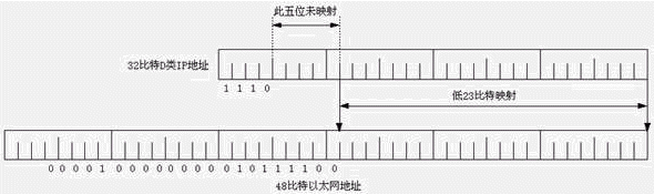 D類地址的最后28比特沒(méi)有結(jié)構(gòu)化,即沒(méi)有網(wǎng)絡(luò)ID和主機(jī)ID之分。響應(yīng)某一個(gè)IP多播地址的主機(jī)構(gòu)成一個(gè)主機(jī)組,主機(jī)組可跨越多個(gè)網(wǎng)絡(luò)。主機(jī)組的成員數(shù)是動(dòng)態(tài)的,主機(jī)可以通過(guò)IGMP協(xié)議加入或離開(kāi)某個(gè)主機(jī)組。IP多播地址影射到以太網(wǎng)地址的方法見(jiàn)下圖。因?yàn)镮P多播地址的高5位未影射,因此,影射的以太網(wǎng)地址不是唯一的,共有32個(gè)IP多播地址影射到一個(gè)以太網(wǎng)地址。