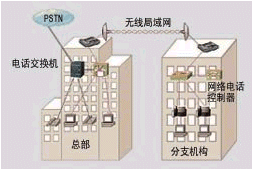 如圖2所示,兩個辦公樓之間距離較遠(yuǎn),不方便布線,其計(jì)算機(jī)網(wǎng)絡(luò)可以通過無線局域網(wǎng)來連接。在總部已有電話交換機(jī)系統(tǒng),這時只需在分支機(jī)構(gòu)中增加Cisco網(wǎng)絡(luò)電話控制器,布署IP電話機(jī),然后通過總部帶語音模塊的Cisco路由器或交換機(jī),接入總部的電話交換機(jī),分支機(jī)構(gòu)就可以享用總部的電話中繼線路,與總部一樣自由地使用電話系統(tǒng)。