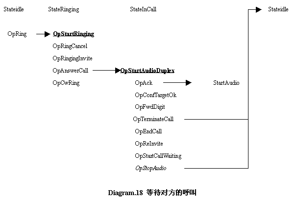 當(dāng)用戶進入Idle狀態(tài)以后,如果系統(tǒng)接收到一個INVITE消息,系統(tǒng)將進入Ring狀態(tài),并且進入Opring操作中,這個時候硬件設(shè)備將播放振鈴聲,這個時候如果用戶決定摘機通話,那么offhook事件就會產(chǎn)生,同時OpAnswerCall將使?fàn)顟B(tài)機進入InCall狀態(tài),向主叫發(fā)送200響應(yīng)消息,同樣RTP/RTCP通道打開,開始通話,如果通話完畢,雙方掛機,那么互相發(fā)送SIP